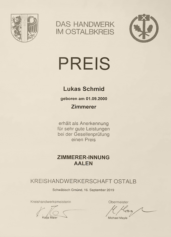 Das Handwerk im Ostalbkreis – Preisurkunde Lukas Schmid